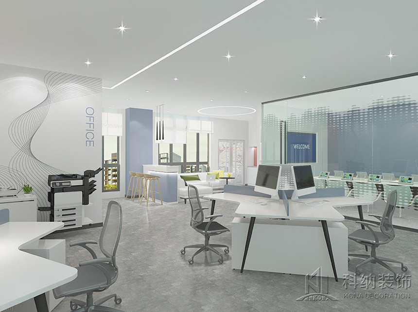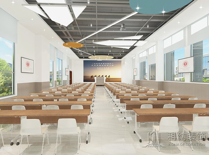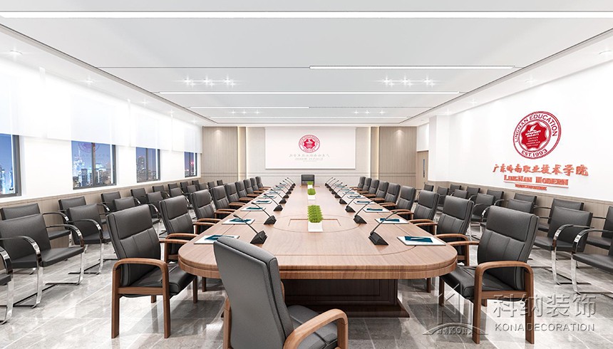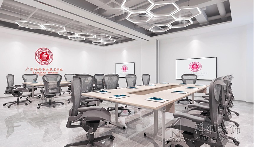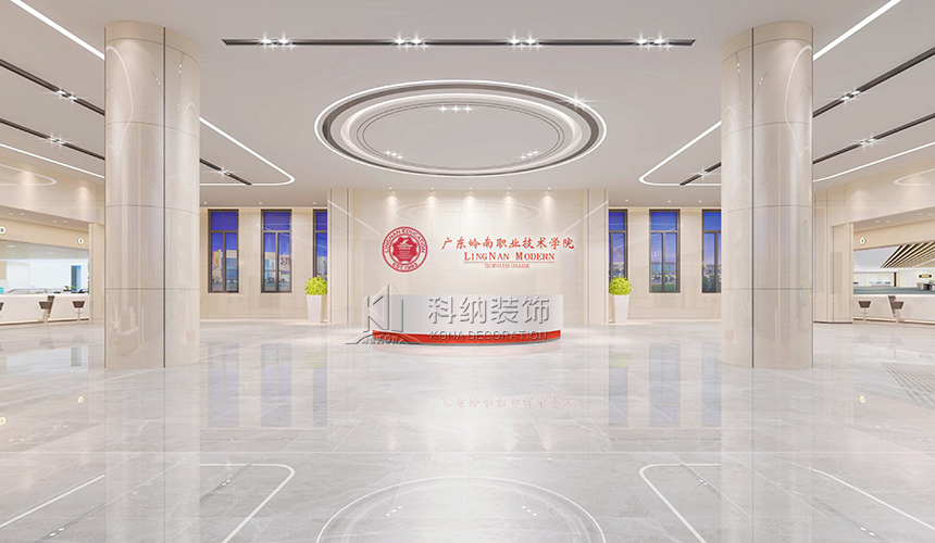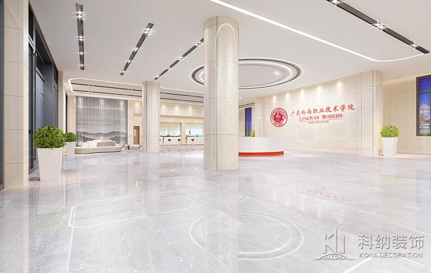 設(shè)計理念:該案例是嶺南學(xué)院清遠校區(qū)行政辦公樓設(shè)計裝修項目,為了使行政樓更好地作為服務(wù)和辦公場所,設(shè)計師根據(jù)使用需求將一層設(shè)計為多功能綜合服務(wù)大廳;二層為校企合作基地,對外辦公;三層作為行政職能辦公室;四層為校領(lǐng)導(dǎo)、核心職能部門辦公室,對內(nèi)辦公;五層作為會議室和檔案室,用于內(nèi)部使用。這樣的規(guī)劃設(shè)計合理,各區(qū)域既聯(lián)系又互不影響,很好地將校內(nèi)外人員分流,最大程度地利用全部空間。天花圓形造型與線條組合,構(gòu)造出“宇宙星空軌跡”,飛機造型吊燈寓意學(xué)生以嶺南學(xué)院為起點,學(xué)有所成,飛向?qū)儆谒麄兏髯缘念I(lǐng)域。墻面以護墻板裝飾,既起到保護墻體的作用,又與整體風(fēng)格相呼應(yīng)。