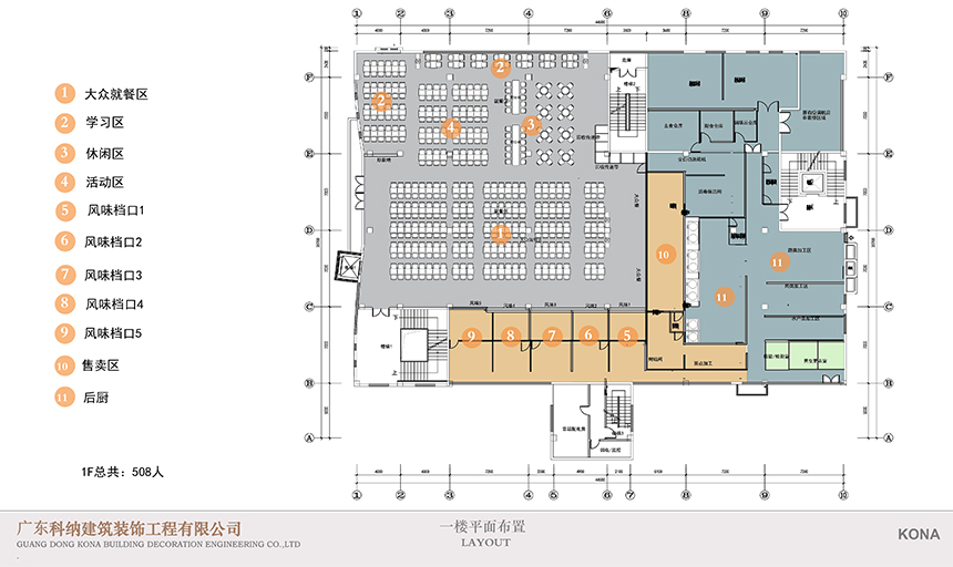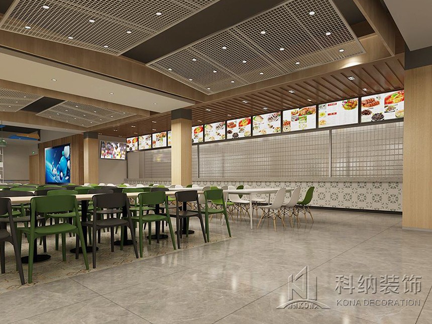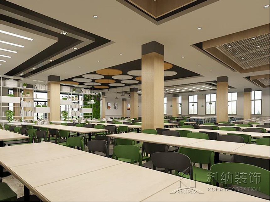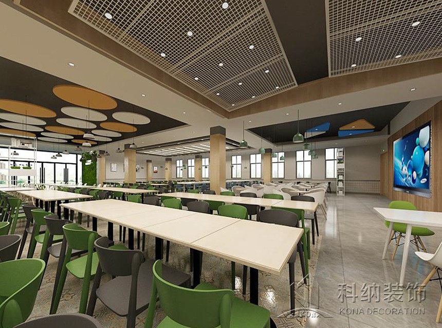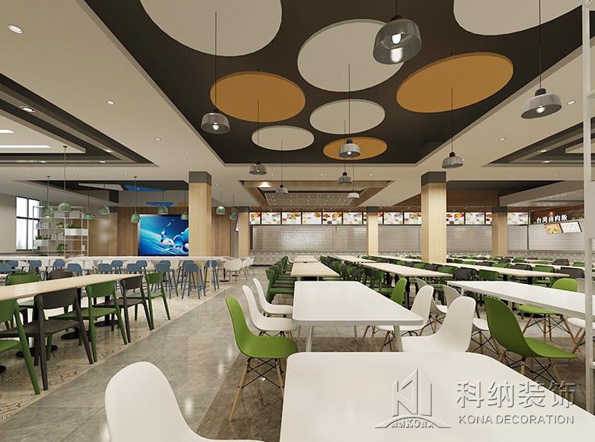 設(shè)計理念:休閑區(qū)的設(shè)計應(yīng)用鮮艷色彩,課后的學(xué)生來到體驗休閑愜意讓人心曠神怡。學(xué)術(shù)交流區(qū)應(yīng)用了可組合的桌椅做搭配,造型吊燈使整個空間顯得生動有趣考慮到多人活動,方便學(xué)生自由組合。團(tuán)體就餐區(qū)橫向舒展的開放式桌椅布局給予一層空間通透且自由的氛圍,由此顯露出交互的趣味性與工作的靈活性。大眾就餐區(qū)的設(shè)計以暖色調(diào)為主,以色彩鮮艷的桌椅做點綴,為空間增加活躍氣息。